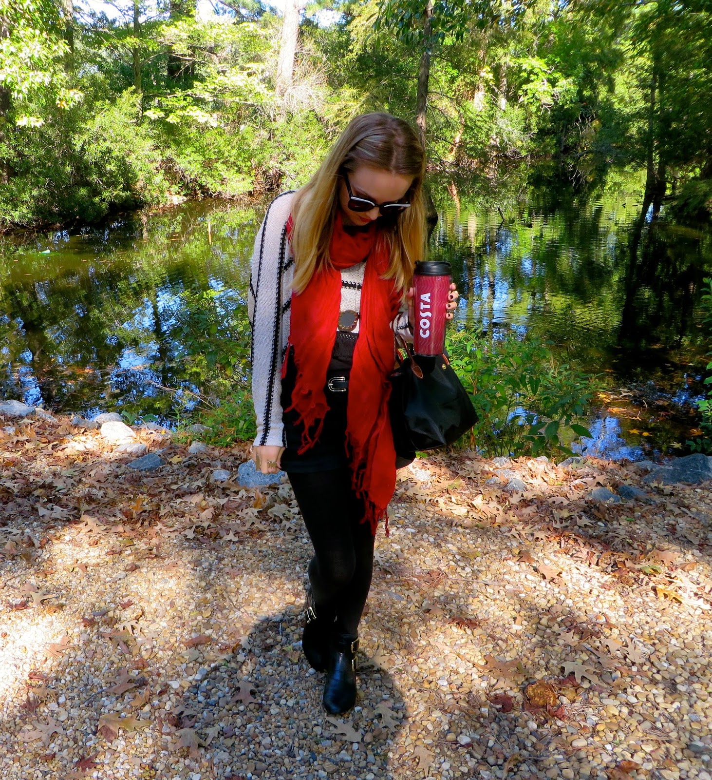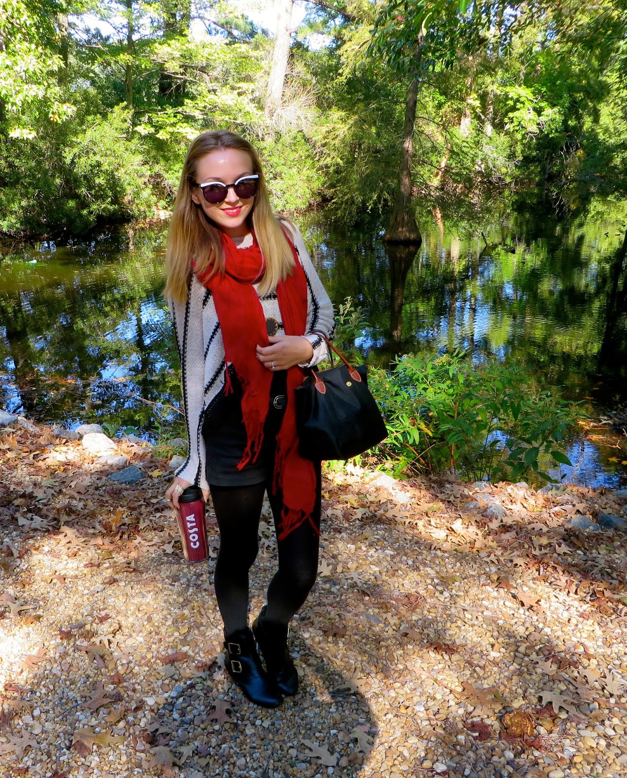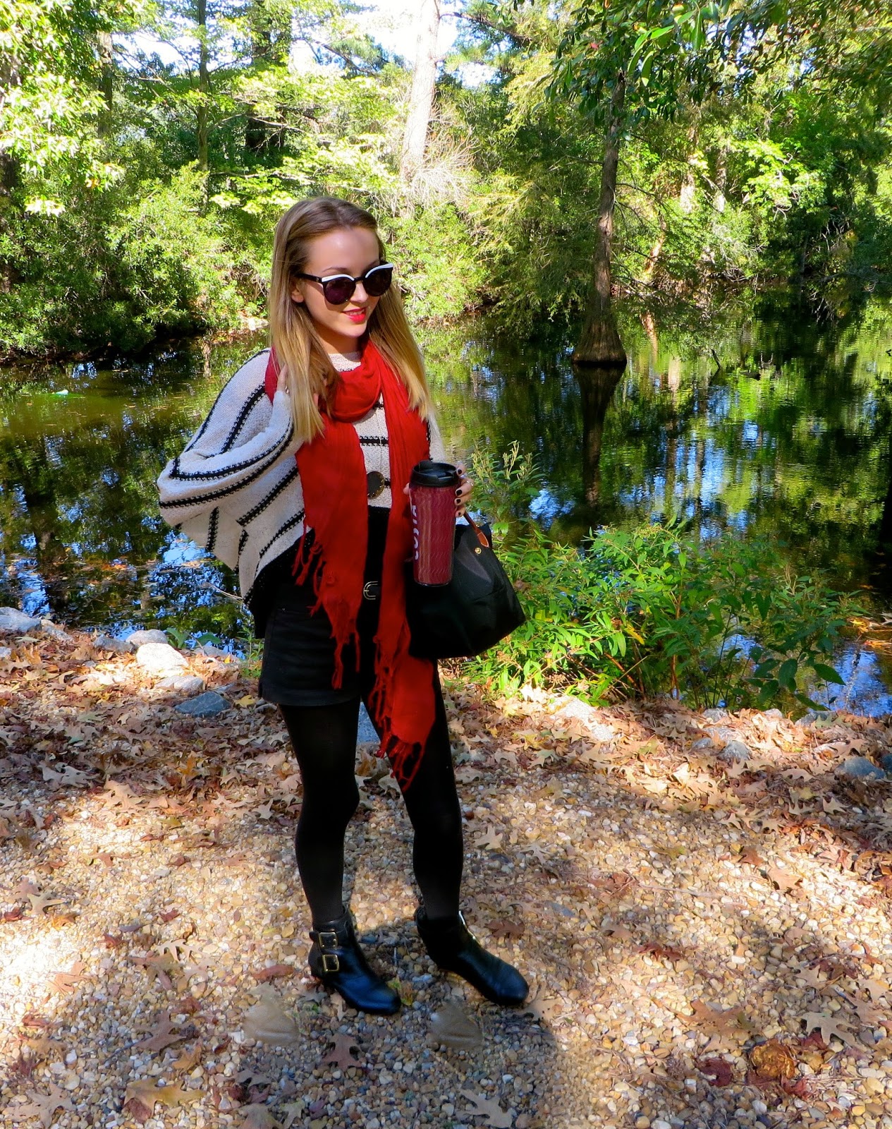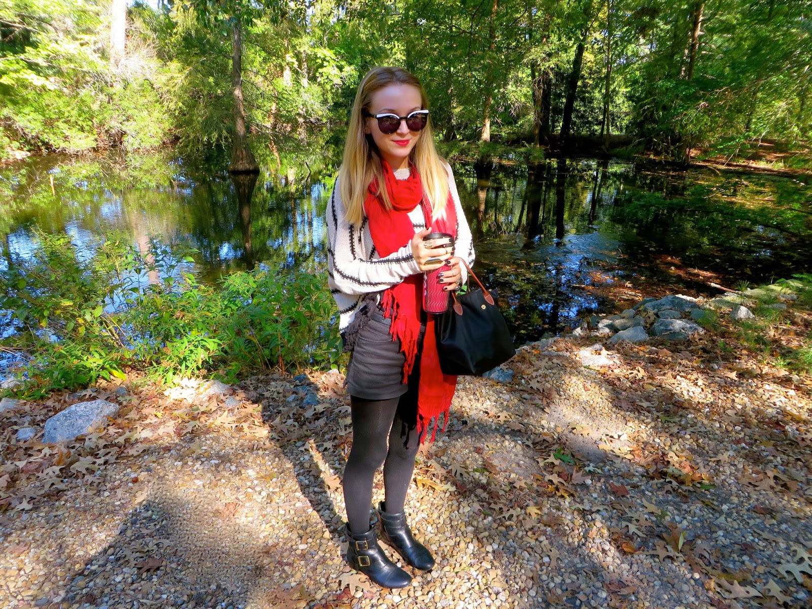 Sunglasses: House of Harlow 1960 ‘Krissy’//Scarf: Love Quotes //Sweater: Miami from Francesca’s //Tank and Shorts: H&M//Belt: Forever21//Tights: HUE //Bag: Longchamp ‘Mini Le Pliage’ (available here) //Boots: House of Harlow 1960 ‘Jackson’ //Jewelry: House of Harlow 1960//Lipstick: MAC Cremesheen Brave Red