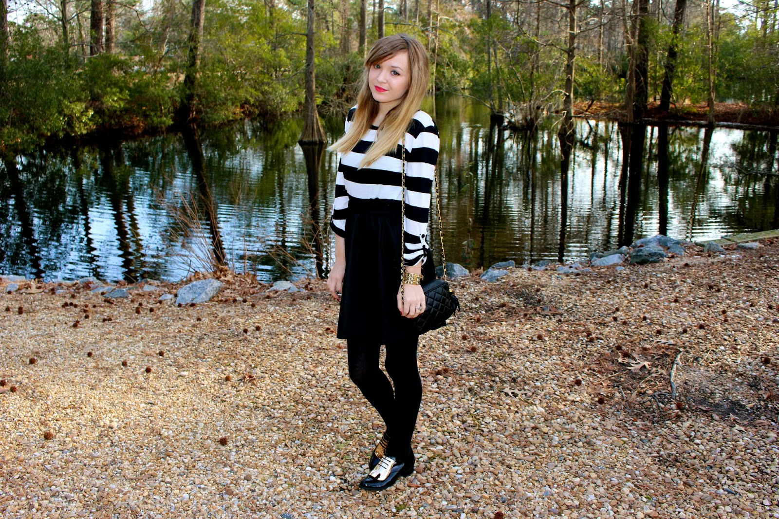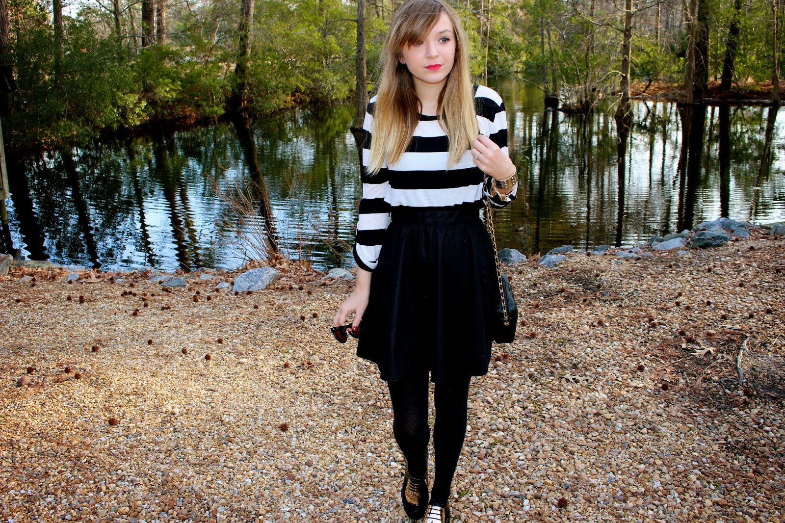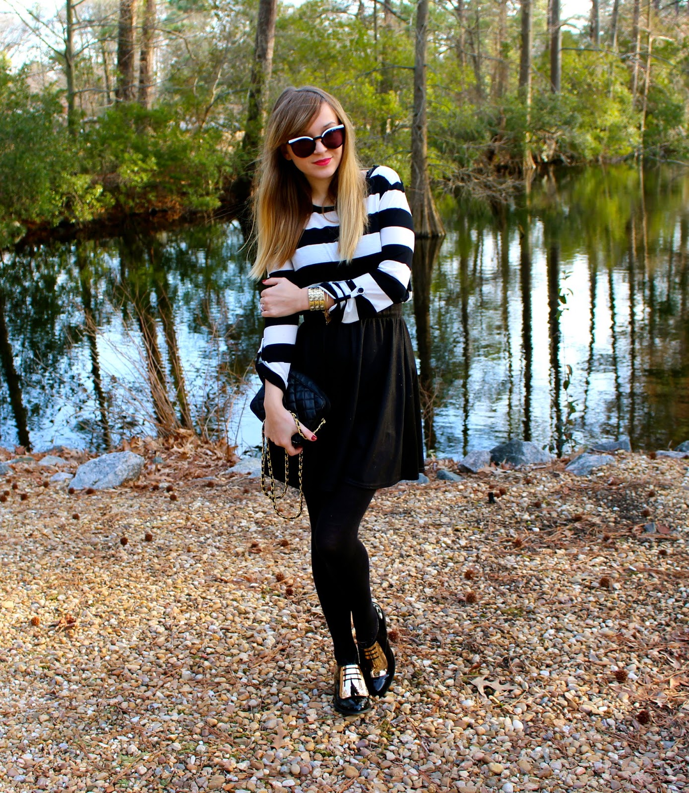 Wearing: Sunglasses-House of Harlow 1960, Top: Forever21, Skirt: Target, Tights: HUE, Oxfords:Anna Xi, Bag: Vintage, Bracelets: Alex and Ani– House of Harlow 1960,