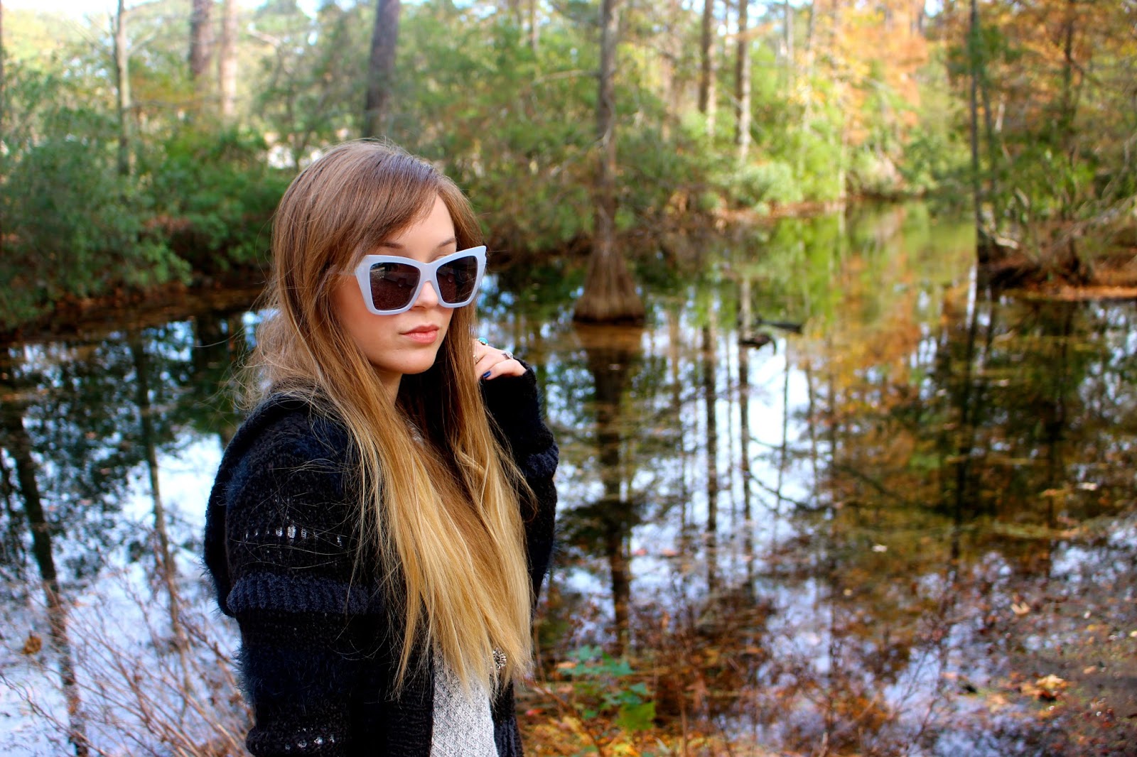 Sunglasses- Le Specs, Cardigan/Shoes/Jewelry- House of Harlow 1960,