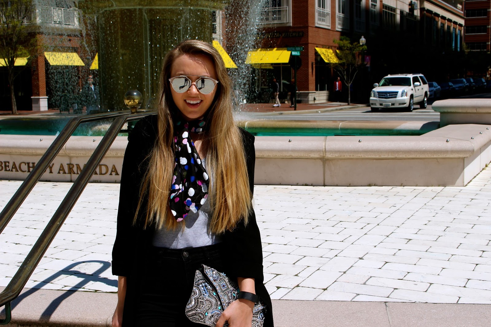 cupsofcouture April 19, 2016 Close Up Mirrored Sunglasses- Wavves (available here) Scarf- Who What Wear X Target Bodysuit- SheIn (available here) Jacket- Primark Jeans- Abercrombie and Fitch Bag- Primark Shoes- Modern Vintage Jewelry- House of Harlow 1960 Bitfit Band Follow: